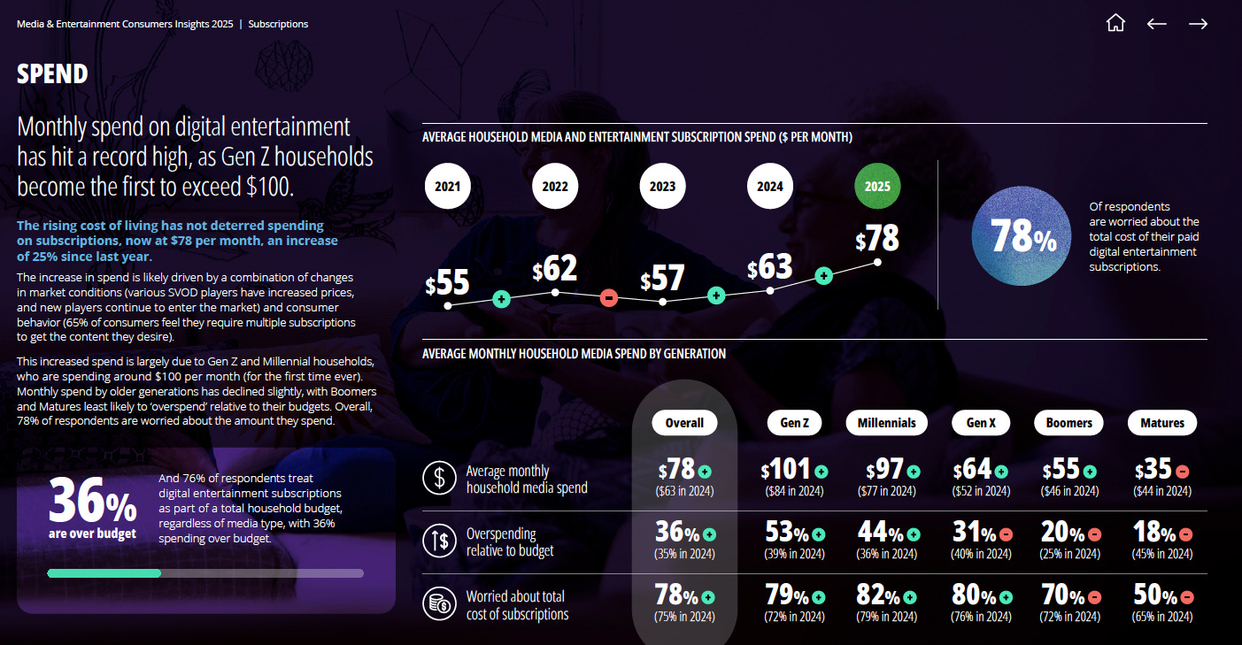 Australian households now hold an average of 3.7 digital entertainment subs (up from 3.3 in 2024), the biggest jump since the COVID-19 pandemic, and