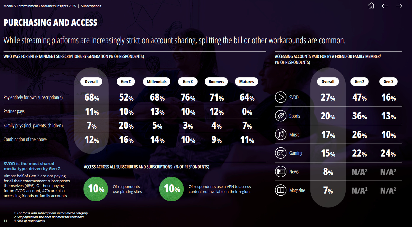 The below graph says that 47% of Gen Z are accessing friends or family accounts. I’d be curious to see a breakdown of how many of those are legitimate accounts where you can pay a service subscriber like Netflix for an additional out-of-house user.