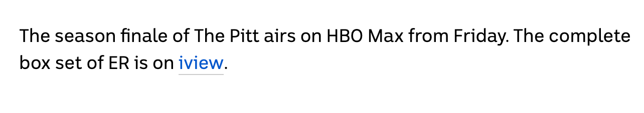 Why is the ABC promoting the season finale of The Pitt? Just say “Australians can watch The Pitt on HBO Max.” Tidy and factual.