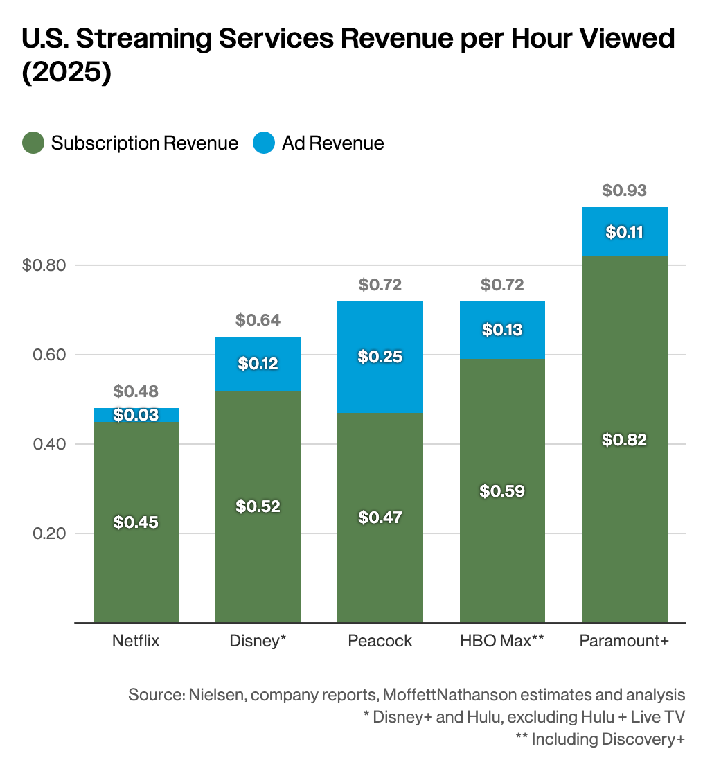 With Netflix raising its US prices, Variety has run a story that says that Netflix makes less revenue per hour viewed. The article is basically seeking to justify Netflix’s desire to raise prices. It doesn’t go into exactly why these revenue figures are so low for Netflix (Is it the content? Infrastructure costs?), nor does it examine inventory volume sold on the ad tier.