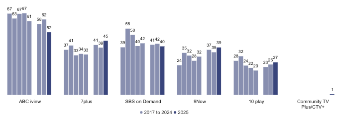 ABC iView remains the most-watched platform for watching broadcast TV catch-up, but declined to 52% from 62%. A major beneficiary was 7plus, which increased to 45%, up from 39%. This places it just ahead of SBS On Demand at 40%.