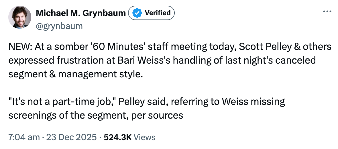 Weiss’ public statement is that she felt that the story didn’t advance the story beyond reporting from other outlets done in the months prior. On the face of it, that’s a fair complaint, but it’s also hard to buy into that when that hasn’t been a guiding light for Weiss in other decision-making at CBS, in her role as a columnist, or in running The Free Press.