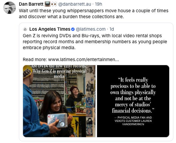 Yesterday saw an article in the Los Angeles Times talking about the rise of Gen Z embracing physical media. The article cites anecdotal comments from video rental stores reporting record months and membership increases as young people embrace physical media.