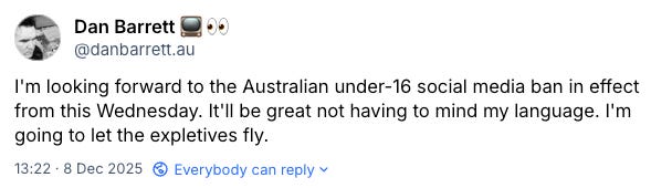 The teens of Australia… and the general Australian citizenry… deserve better than the legislation that has been put in place. I prefer that there is the legislation than nothing being done at all, but the implementation of this has been a whole lot of nonsense.