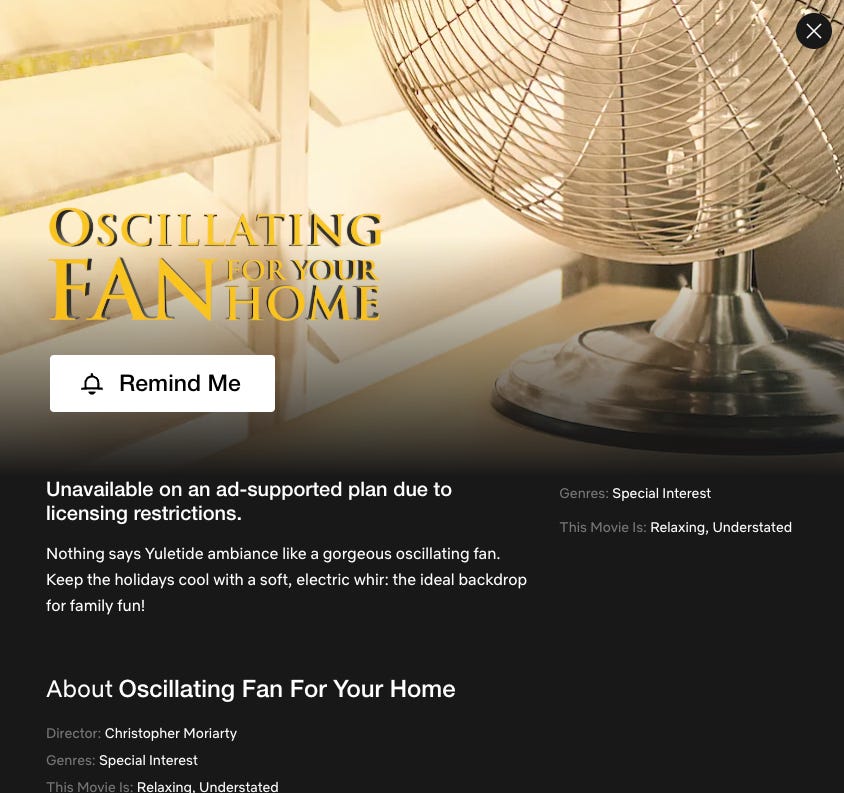 Yuletime log videos aren’t seasonally appropriate here in Australia, so back in December 2015 just after Netflix launched, it commissioned and released ‘Oscillating Fan For Your Home.’