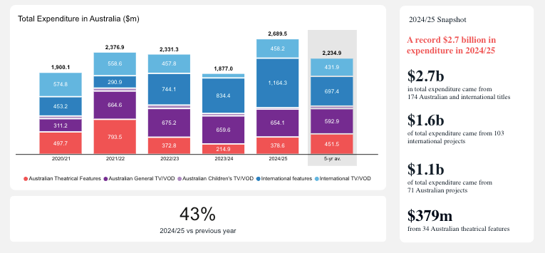 As per Screen Australia’s annual Drama Report, in 2024/25, drama production in Australia reached a record $2.7 billion in expenditure, that’s up 43% from 2023/24 with a $678 million uplift in international production.